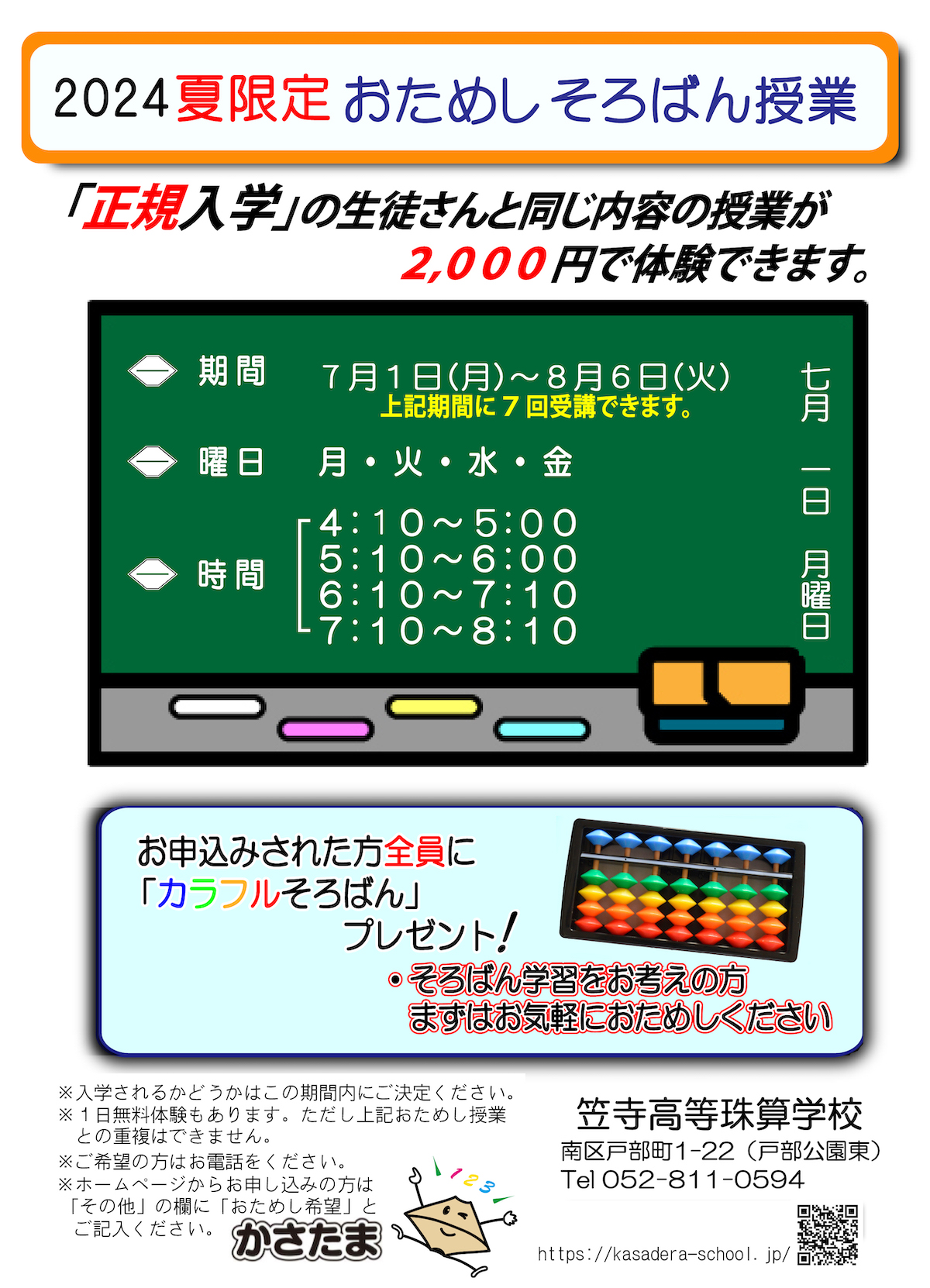 【2024 夏限定 おためしそろばん授業】「正規入学」の生徒さんと同じ内容の授業が2,000円で体験できます。