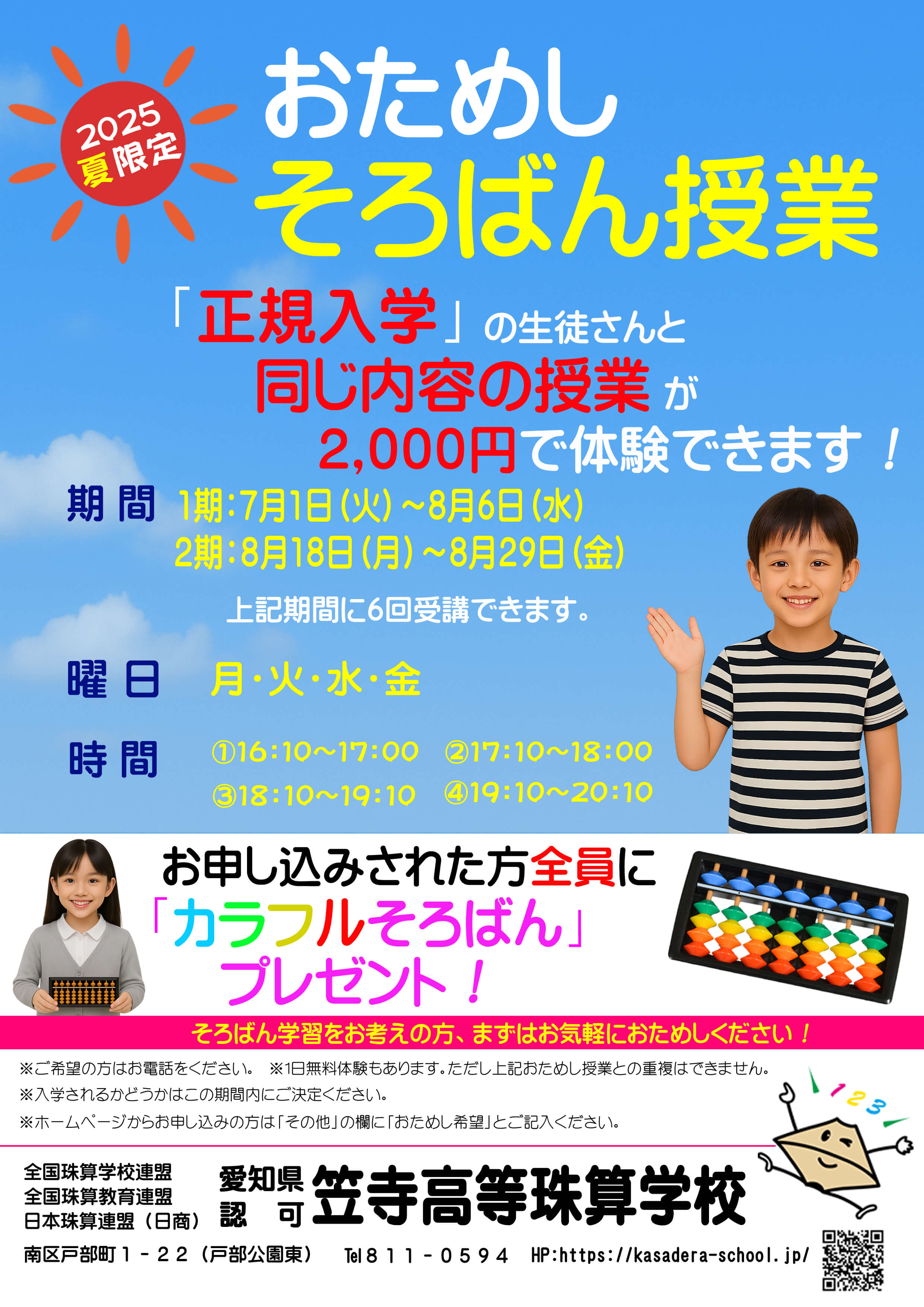 毎年ご好評の「夏限定 おためしそろばん授業」が始まります。お気軽にお申込みください。